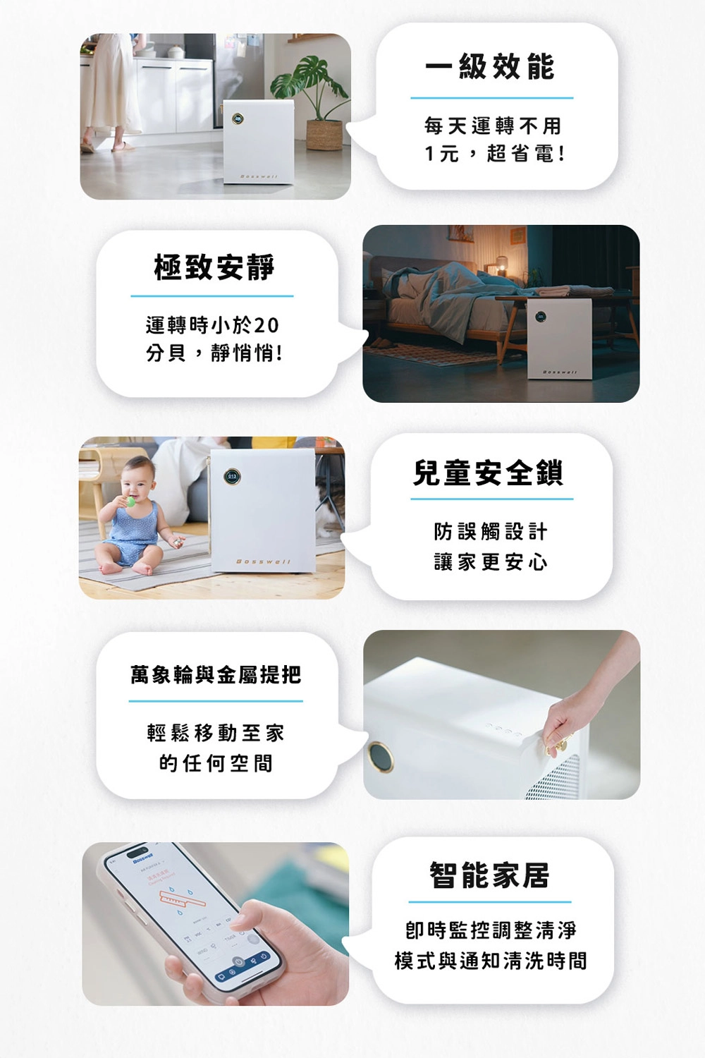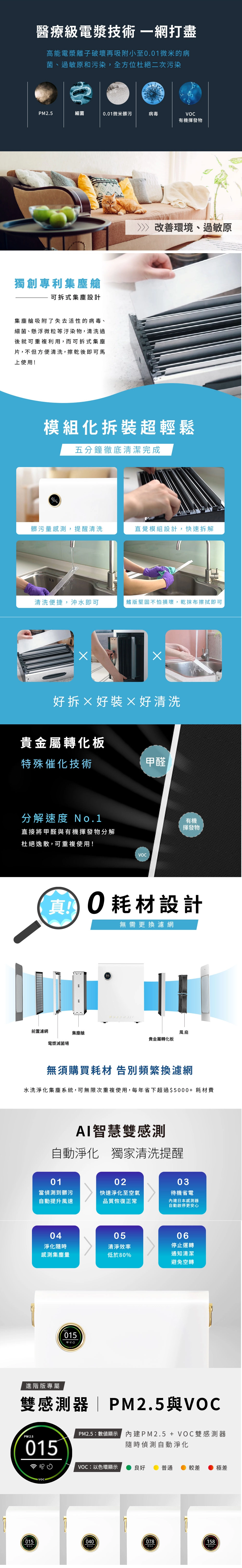 最新專利模組化集塵艙,快乾不用 5 分鐘 搭載APP,手機+遠端遙控,智能生活聰明選擇 通過1 級能效,全天不關機也花不到 1 元 升級VOC(揮發性有機物)+PM2.5雙感測器,偵測空氣中污染氣體 智能淨化鎖定空氣中隱藏威脅,讓生活全面升級