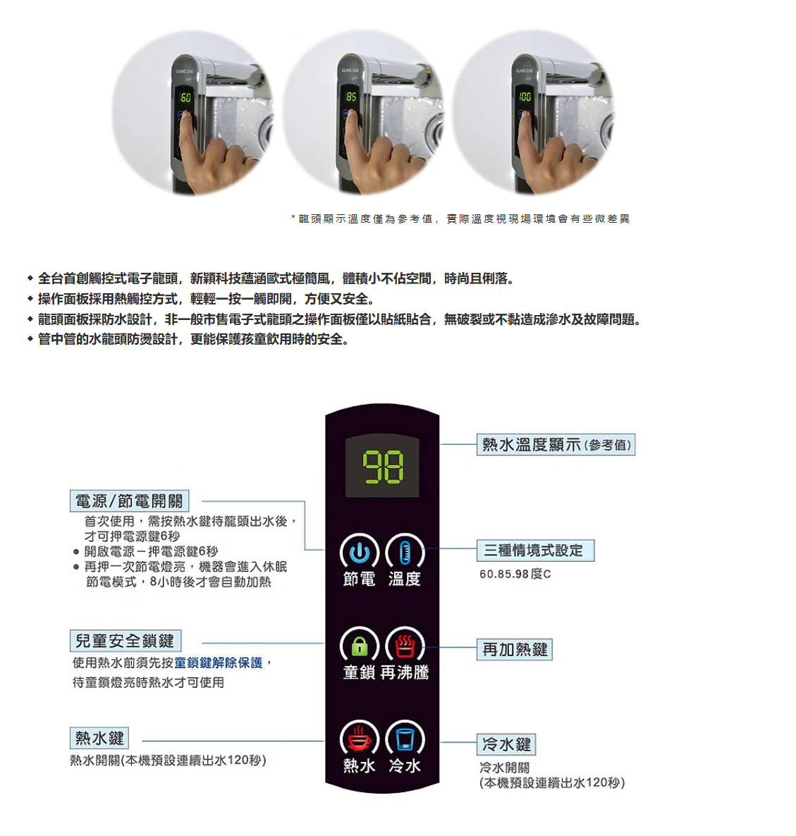 龍頭上方觸控面板,外型就像一台智慧型手機,金屬亮面外觀走歐風時尚路線,裝置後廚房檯面依舊清爽,龍頭可以180度旋 轉,隨意調整取水位置,使用上更加俐落,操作方面採用觸控方式,輕輕一按就可取水,不用按壓不留指紋