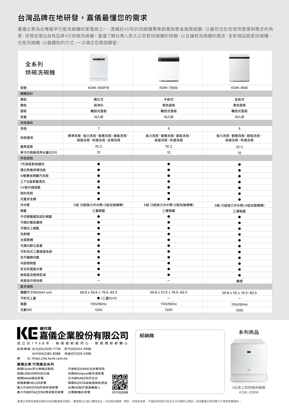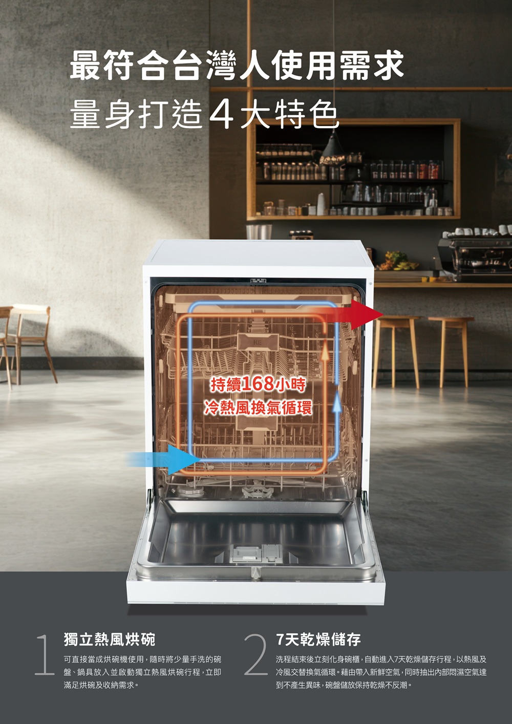 保固期 1年保固期 商品規格 .16人份 .單獨熱風烘乾 .7天乾燥儲存(168小時冷熱風換氣循環) .7 種洗程:標準、強力、智慧、節能、殺菌、 快速、自潔 .最高溫75℃ .AI智慧偵測髒污技術 .上下單層分區清洗 .無刷直流變頻泵浦+全不鏽鋼內膽 .UV紫外線除菌 .三層碗籃架+5組噴水臂 .雙重防漏水安全設計 .尺寸:寬59.8 x 深59.6 x 高79.5-82.5 cm .可拆式上蓋:3公分 (最低76.5cm) .電壓:110V/60Hz