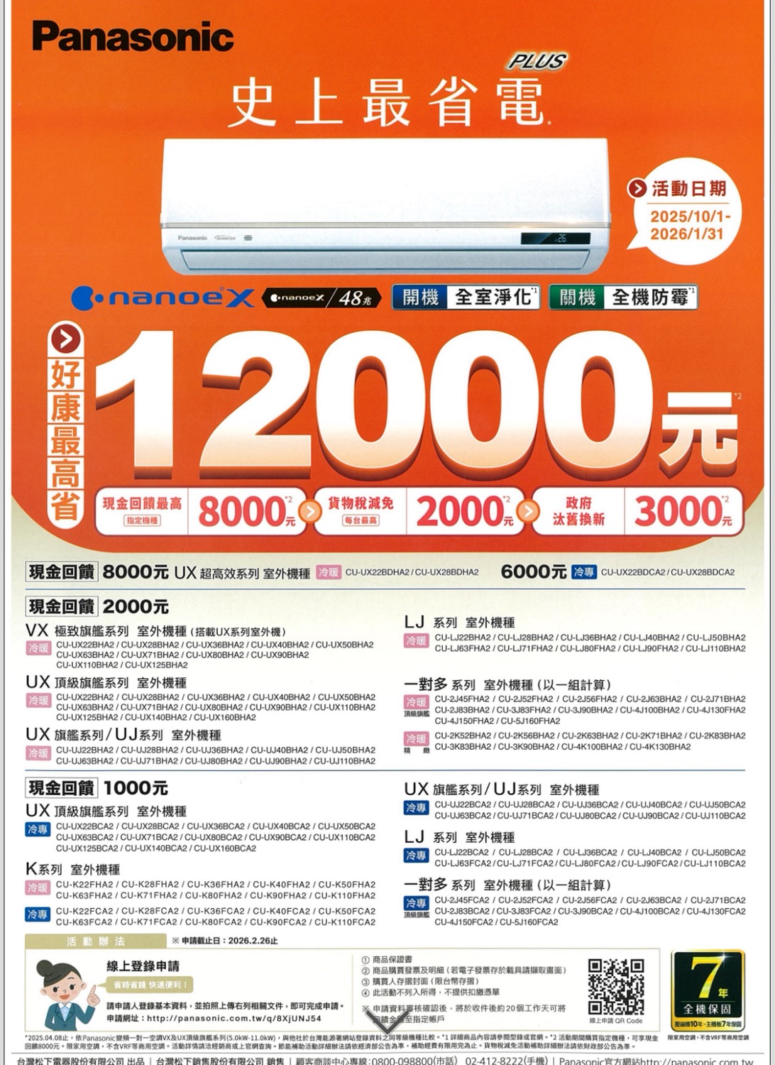 Panasonic買國際牌冷氣買國際牌冷氣購買家用空調指定機種,好康最高省12000元115/01/31止