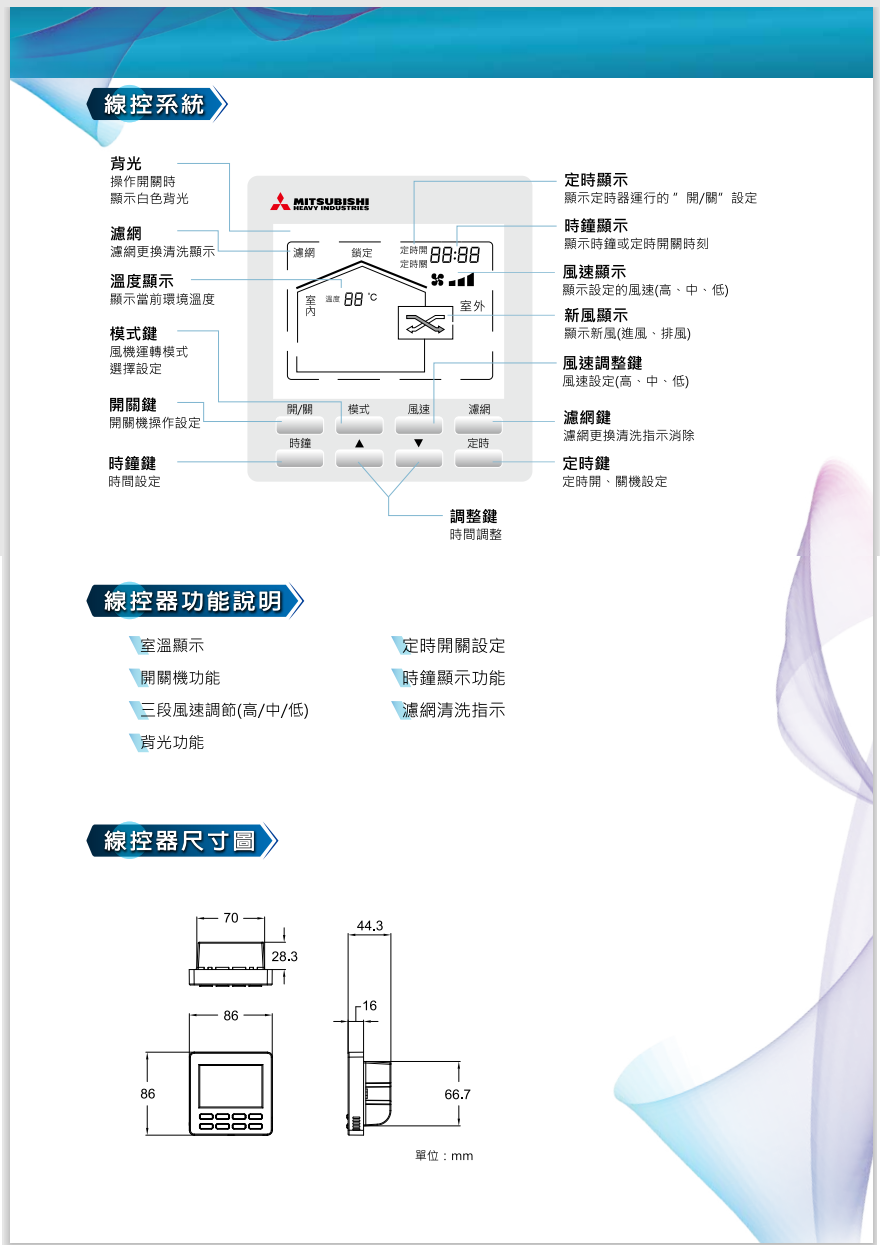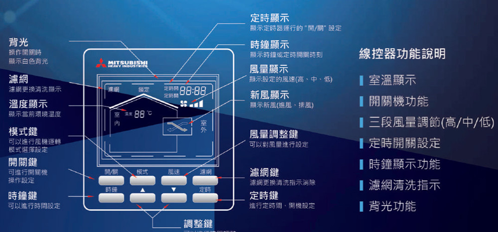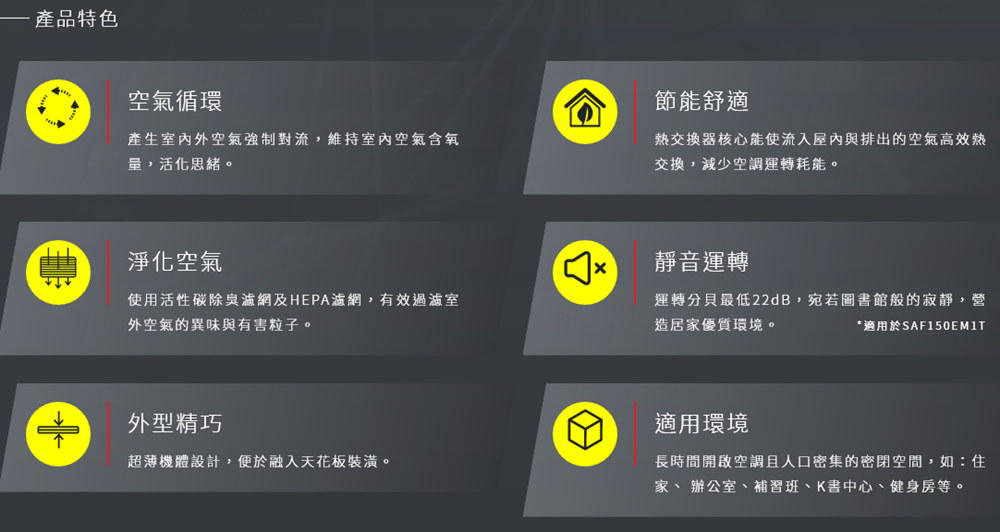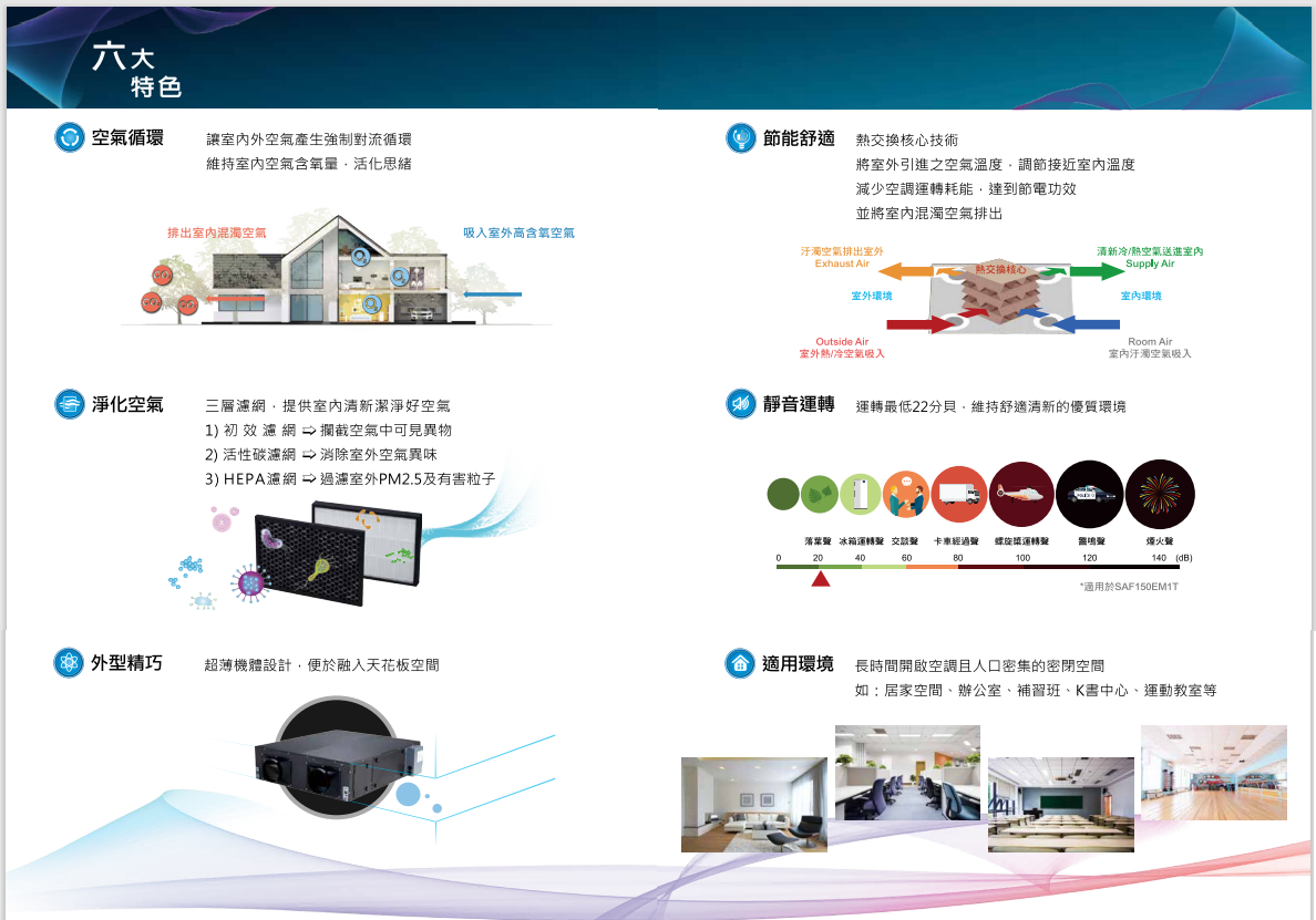 商品描述 三菱重工 全熱交換器 全屋空氣活化機 PM2.5過濾型 特點: 空氣循環-提高空氣含氧量 淨化空氣-可過濾PM2.5 型號:SAF250EM2T(全新品) 尺寸:270×865×740 電源:220V/60Hz 消耗功率:197W 重量:35kg 濾網配備:初效濾網×2、活性碳+HRPA複合濾網×1 附件:線控器(控制線自備)