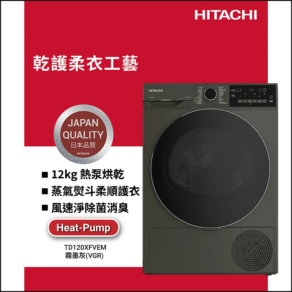HITACHI 日立 220V電壓 12公斤 熱泵滾筒乾衣機 TD120XFVEM+基本安裝